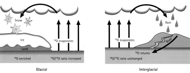 幸运的是,自20世纪50年代起,一种能有效处理更新世冷暖交替顺序的方法诞生了。该方法利用了这一事实:与地表不同,海床则包含了一个在长时间内几乎未被破坏的沉积物堆积记录。而且这些沉积物还包含有孔虫(forams)遗骸,这种微生物的“外壳”(坚硬的外层覆盖物)提供了其生活时期的海洋温度记录。终其一生,有孔虫都会从周围海水中吸收两种不同的氧同位素。寒冷时期的海水富含重的氧同位素;反之,当海水转暖,较轻的氧同位素含量就会上升。所以,当科学家们从海底钻出垂直岩石核时,他们便是在复原一个气候变化的连续记录,通过对岩石核中有孔虫的外壳进行同位素分析便可得到这种记录。接下来,该记录的时间信息可以结合其他几种不同的定年法进行校准。其中之一便是古地磁学,该技术研究地球磁场的周期性改变这一事实。
