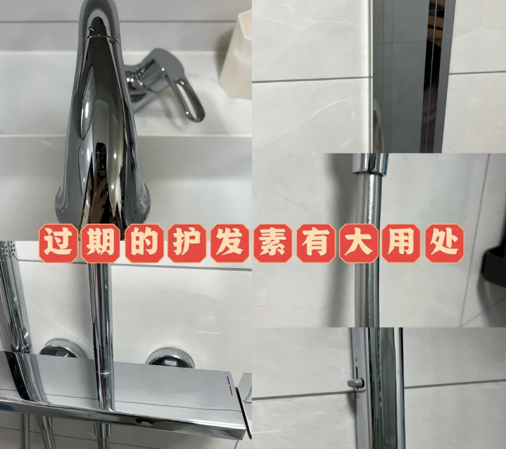 另外,浴室里的花洒、水龙头、镜子,用护发素简单擦一遍,再冲洗干净,