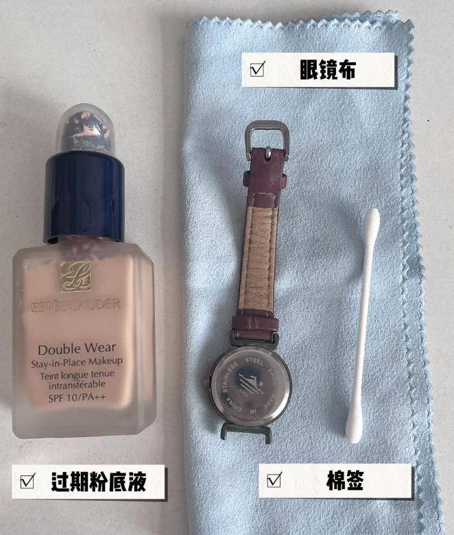 用棉签蘸一点过期粉底液,轻轻涂在氧化区域,停留一小会儿,再用眼镜布反复擦拭。