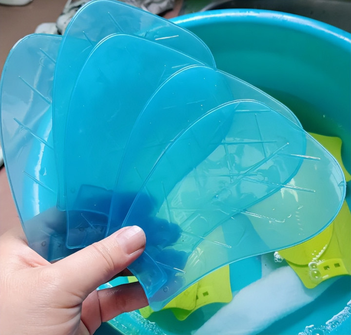 把卸妆水倒进盆里,加点温水,把拆下来的扇叶放进去泡一会儿,不用怎么刷,油灰自己就松动了,冲一冲就干净。