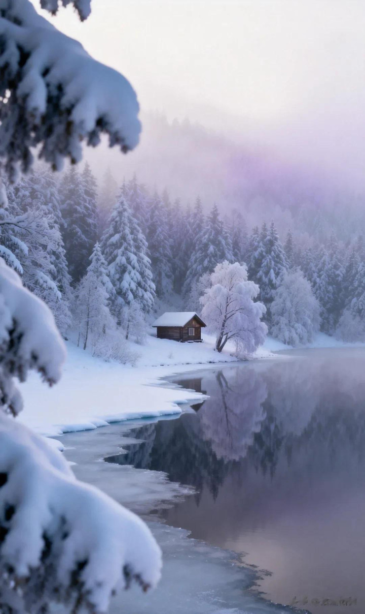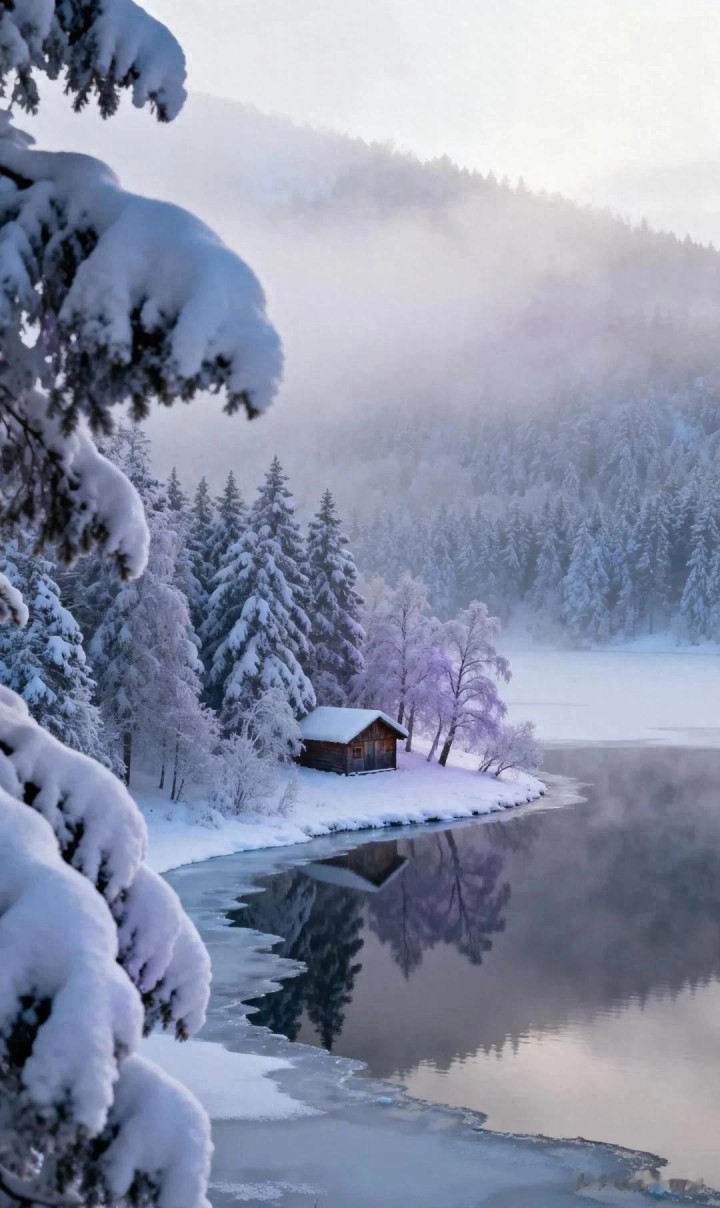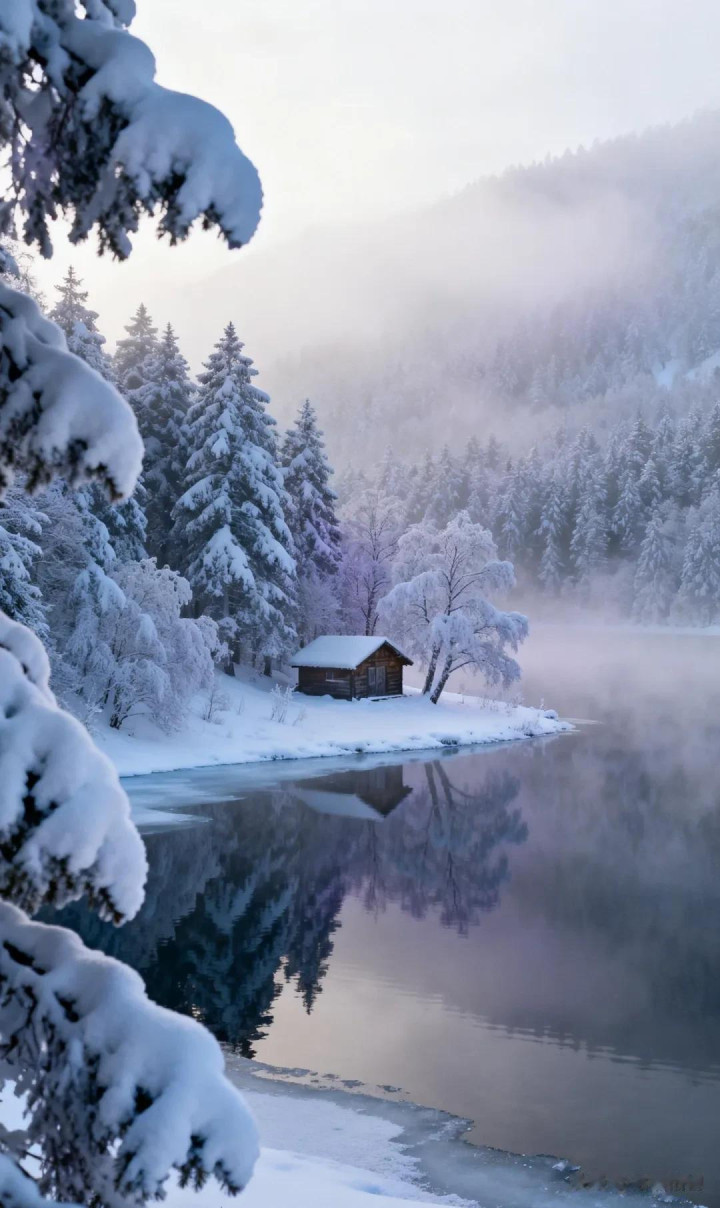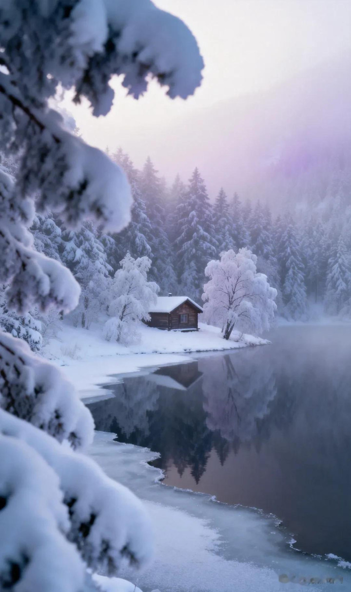 而那座小木屋就守在湖畔,窗口透着暖色微光。