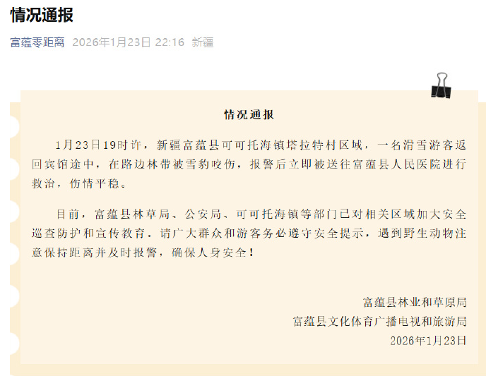23日晚,阿勒泰地区富蕴县林业和草原局、富蕴县文化体育广播电视和旅游局发布通报:1月23日19时许,新疆富蕴县可可托海镇塔拉特村区域,一名滑雪游客返回宾馆途中,在路边林带被雪豹咬伤,报警后立即被送往富蕴县人民医院进行救治,伤情平稳。