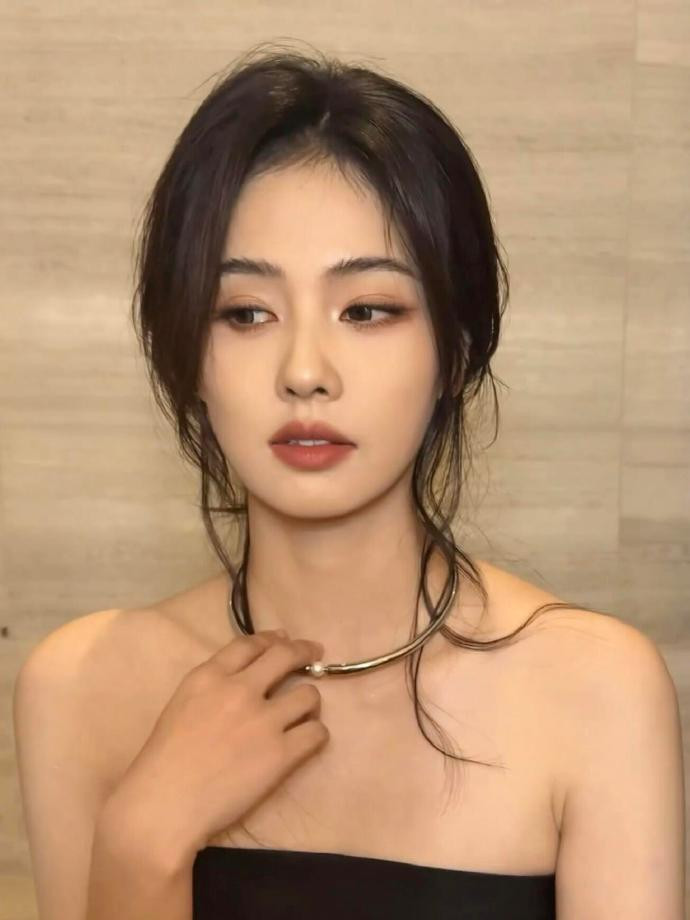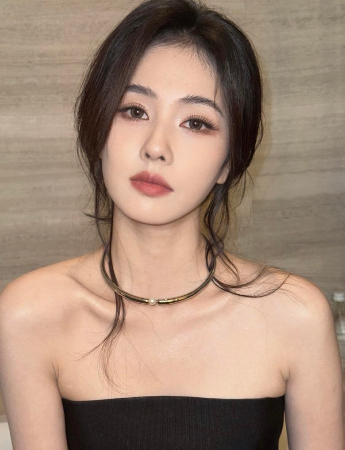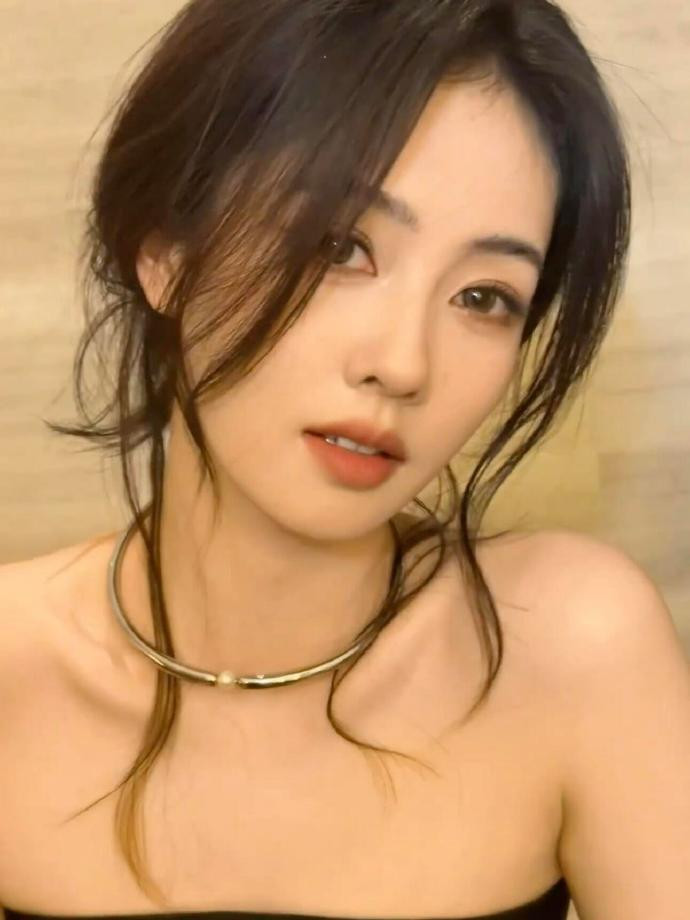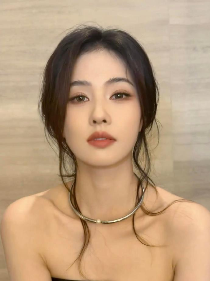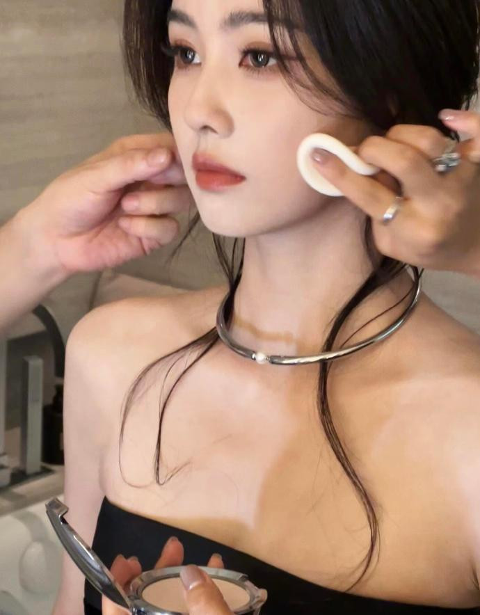化妆镜前的白鹿,把 “冷艳贵气” 揉成了松弛的日常感。黑抹胸衬得肩颈线条清瘦利落,金属 choker 缀着一颗珍珠,冷硬与柔润撞出恰到好处的疏离感 —— 没用力凹造型,只是垂着的碎发扫过颈间,就把 “漫不经心的精致” 焊在了气质里。