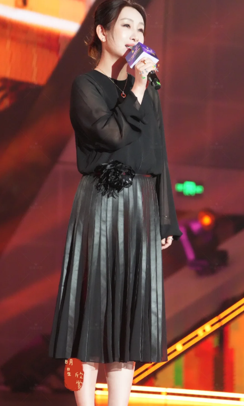 说实话,这次她的造型算是比较简单的,上半身黑色纱衣搭配同色系百褶裙,穿在她身上没有违和感,又不会给人单调的感觉,头发简简单单往后面一挽,看起来格外松弛。