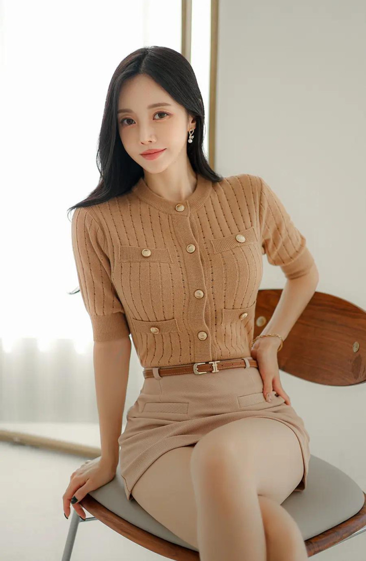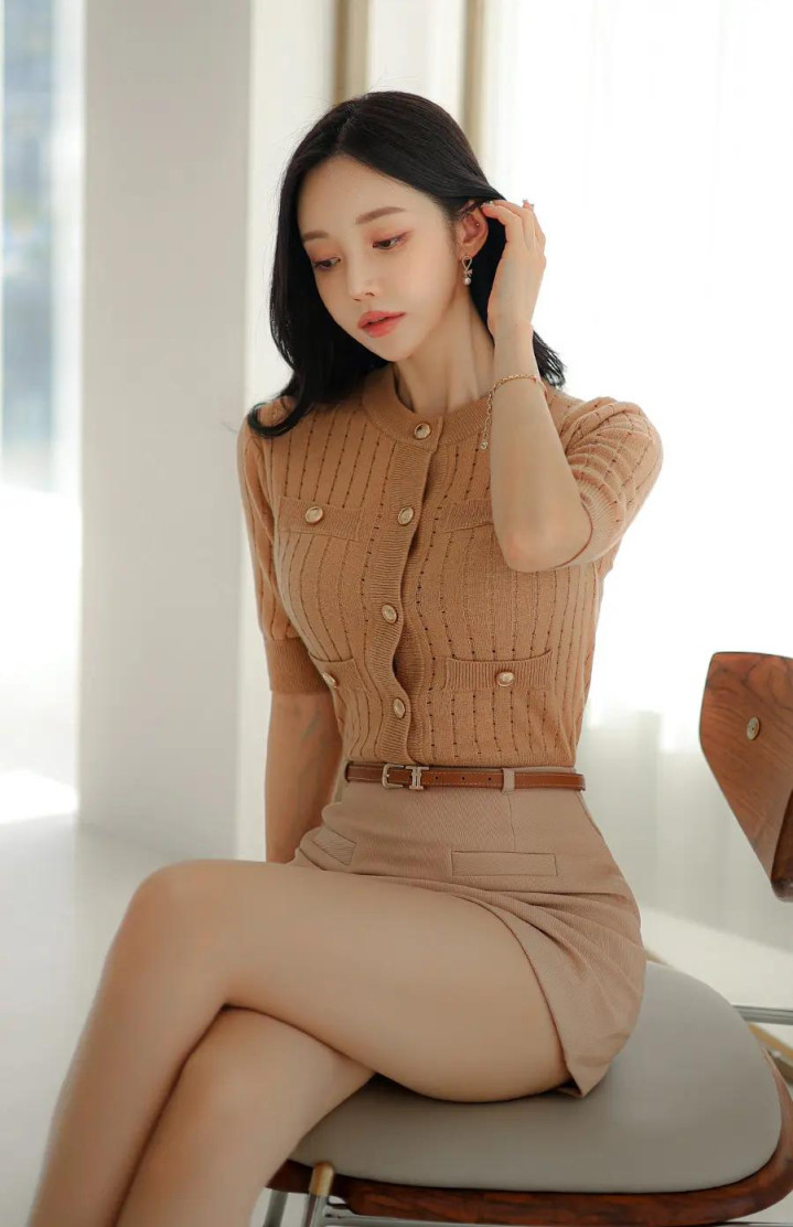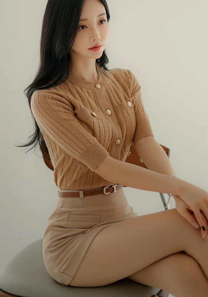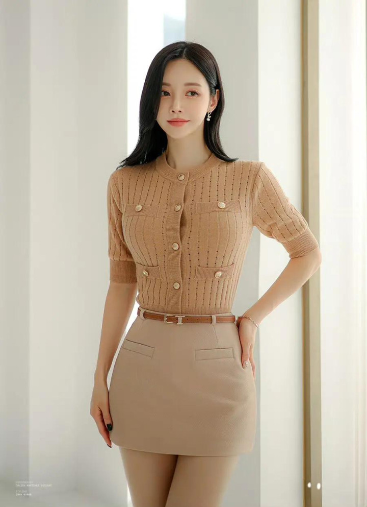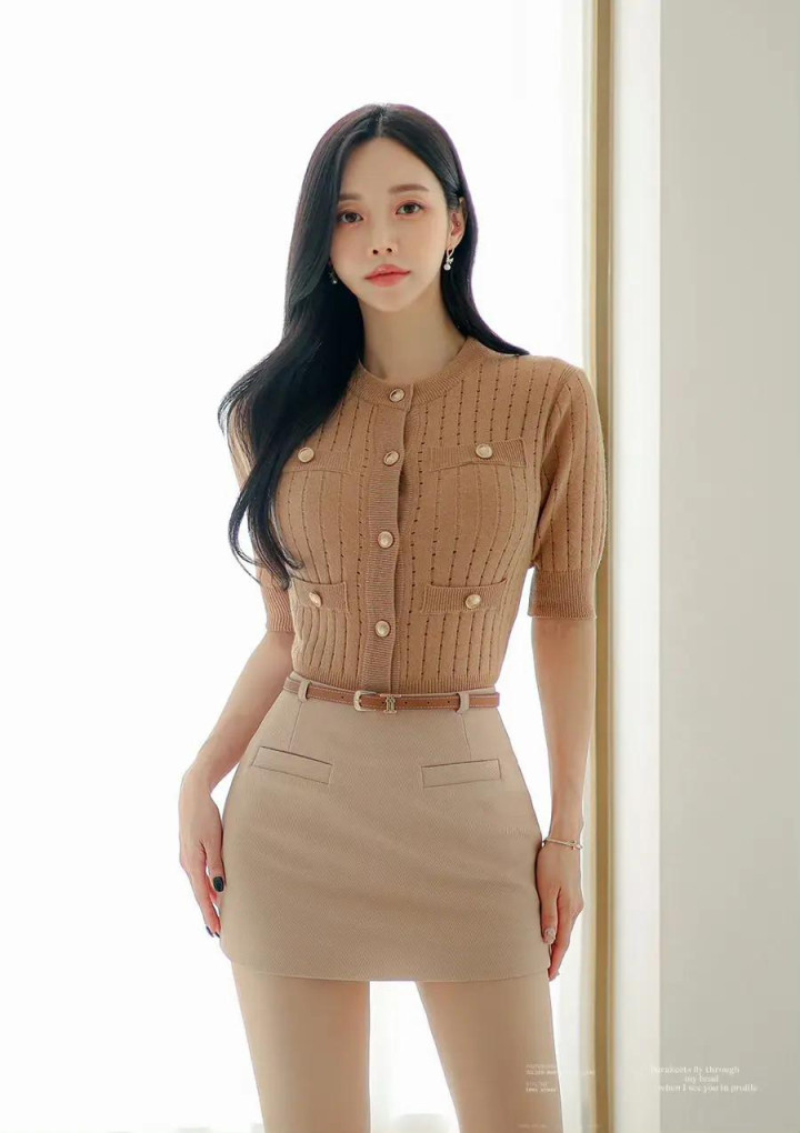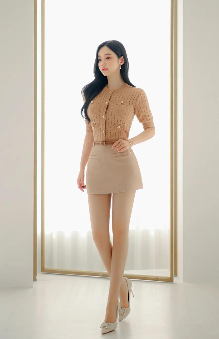 开云官方体育app 驼棕针织裹着金扣的柔, 浅褐短裙衬出腰线的韵