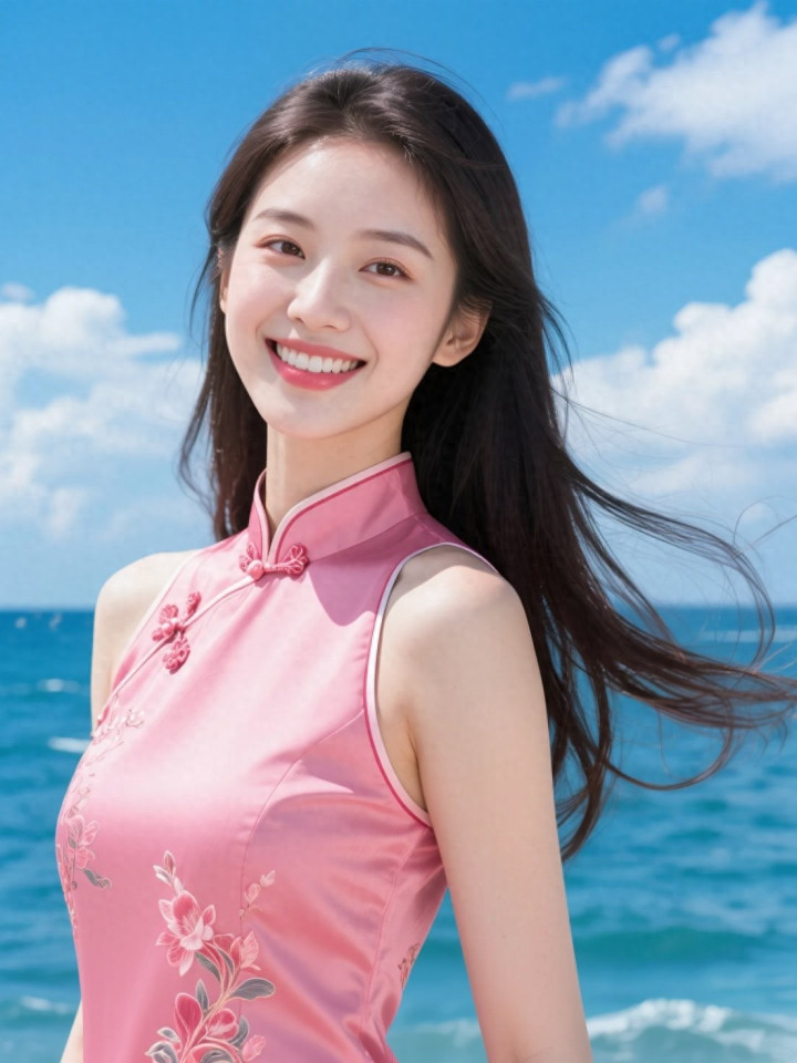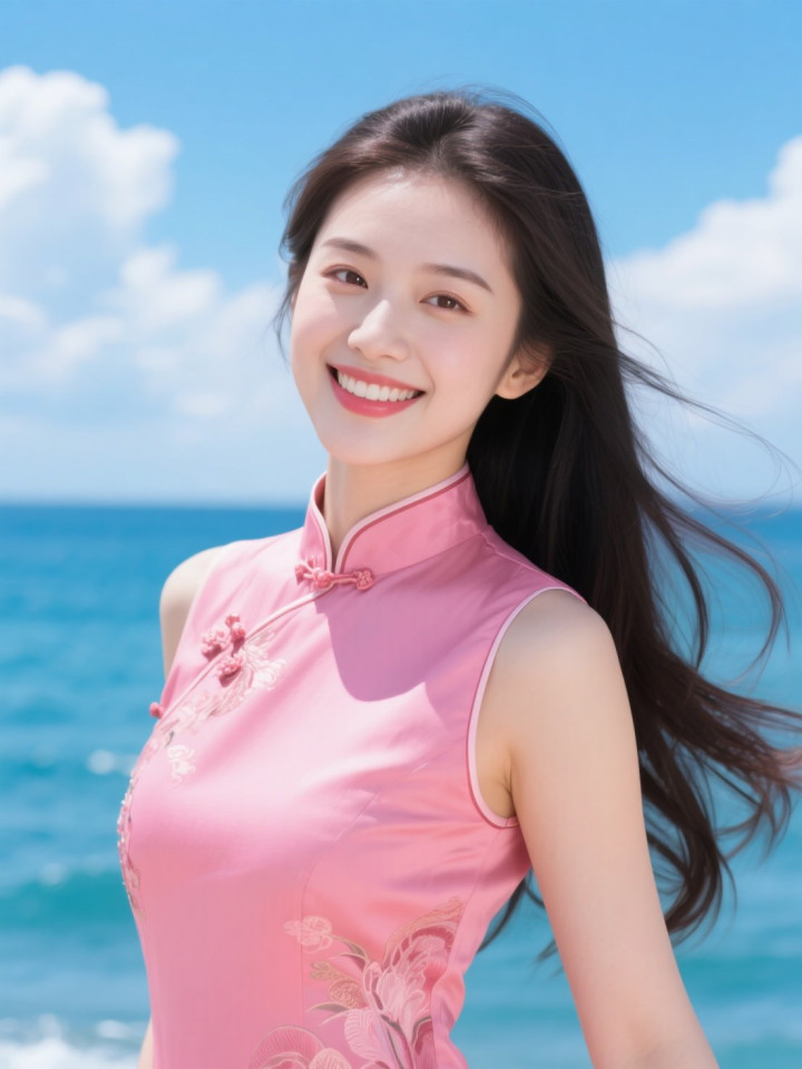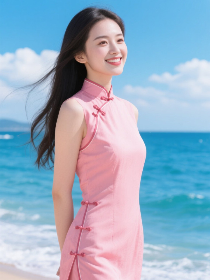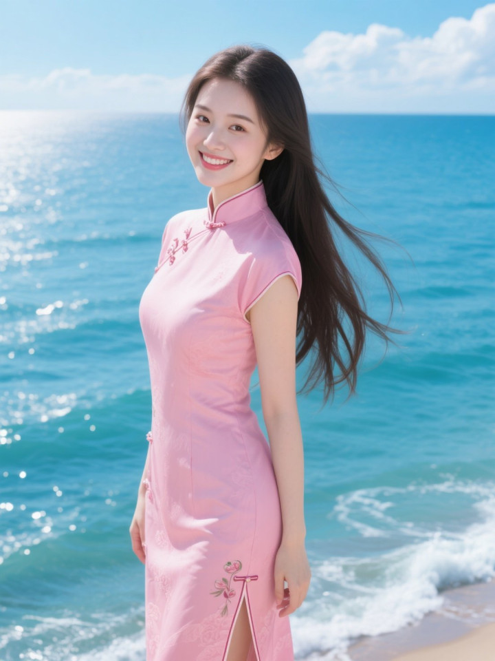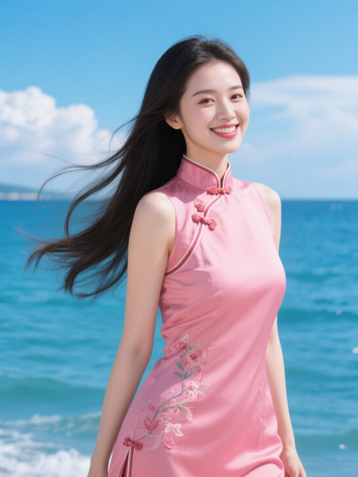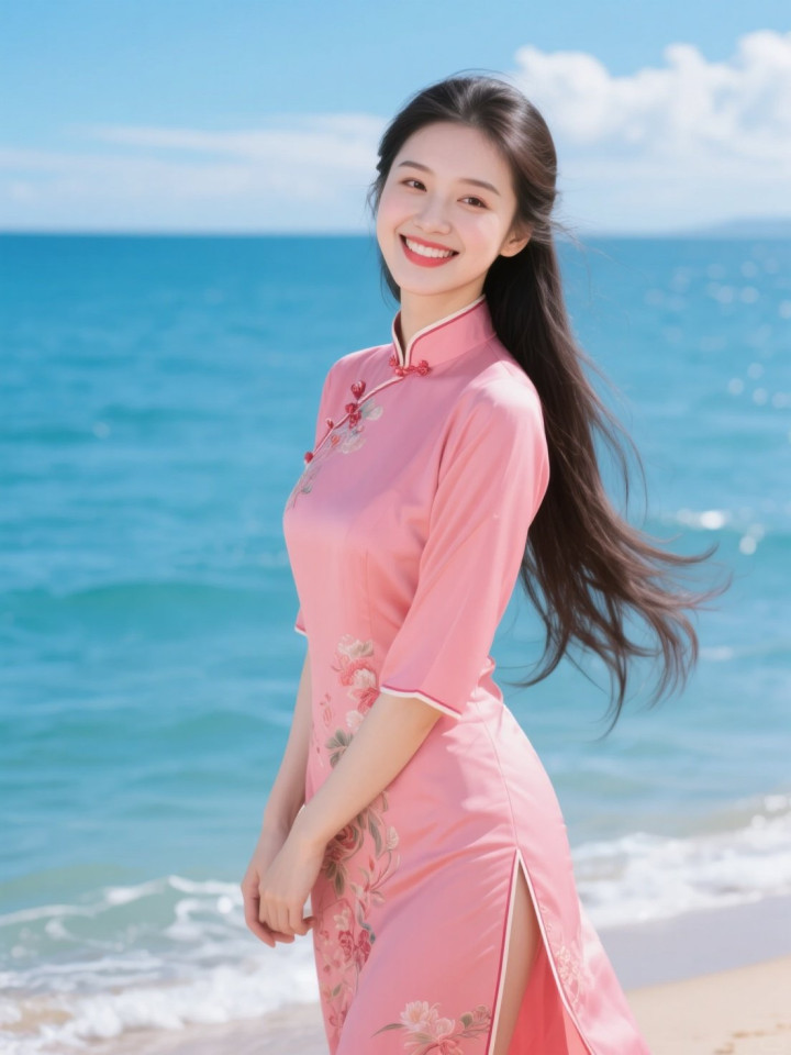 开云官方体育app 蓝天碧海与穿粉色旗袍的美女