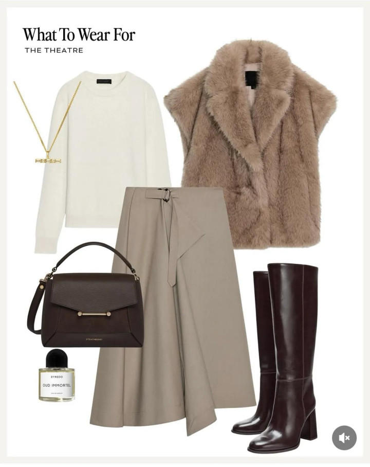 还有属于皮草更迷人的穿法哦,普通法圆领毛衫可以搭软糯的皮草马甲,不仅御寒还能增加贵气的层次感,再搭一条几何式剪裁的半裙,搭笔直线靴筒的深酒红长靴,又把皮草开发出不同穿法啦。