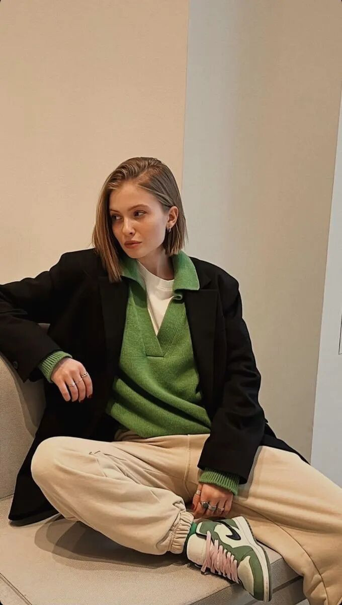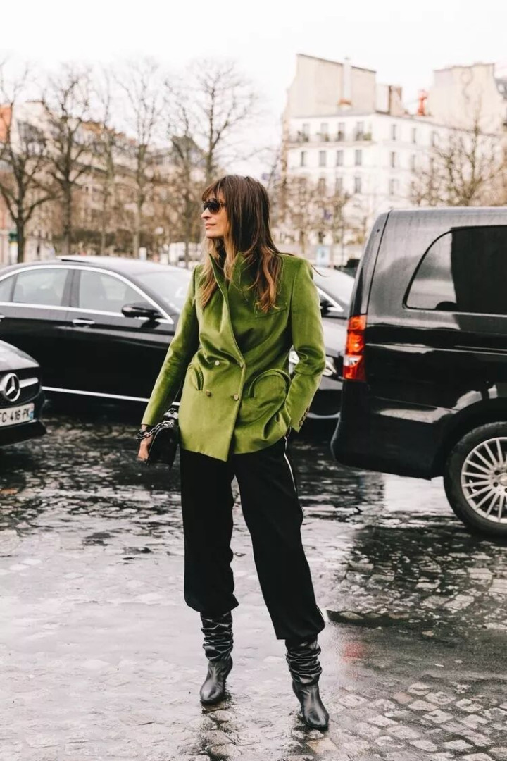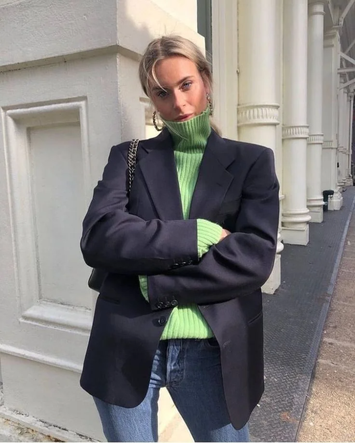 黑色西装外套内搭绿色毛衣,搭配绿色包包呼应起来,这一抹绿打破沉闷,清冷又时髦,谁看了不说一句 “姐姐好会穿”!