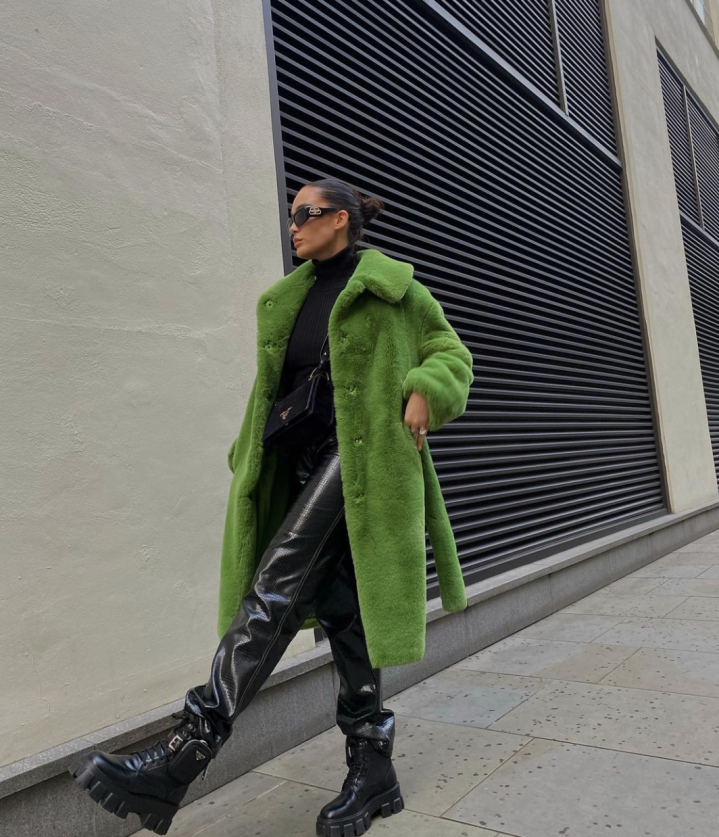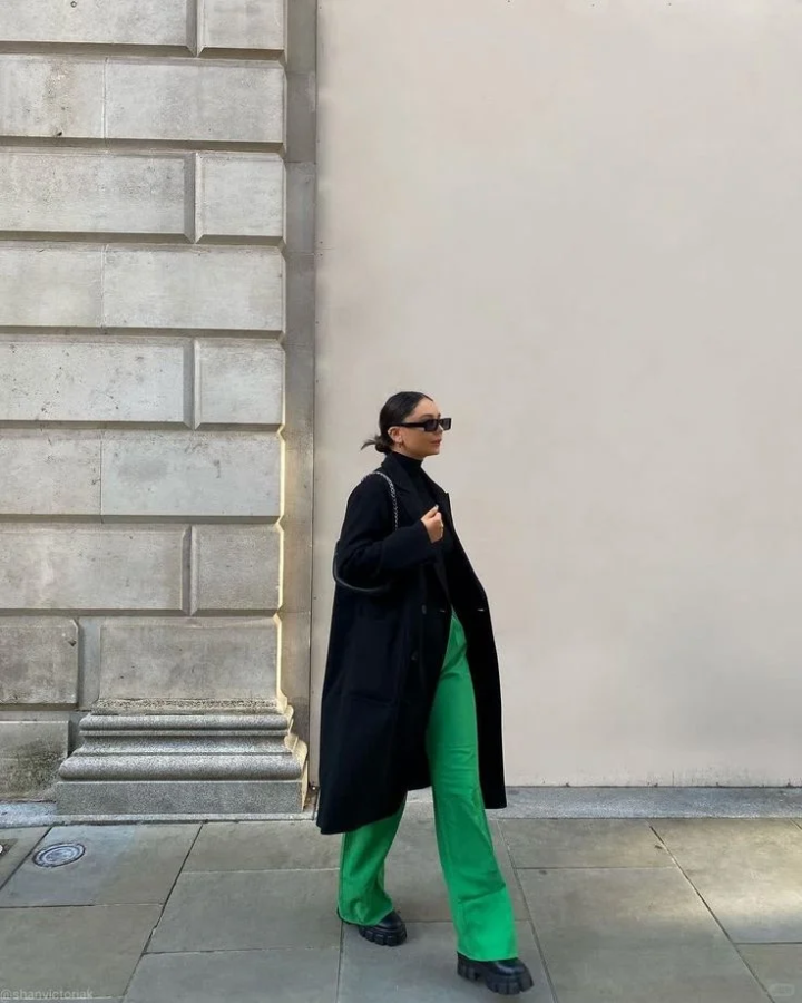 黑色长款大衣垂坠感拉满,内搭全黑打底让荧光绿阔腿裤成为视觉中心,厚底鞋 + 墨镜的组合,把 “生人勿近” 的气场焊在身上。通勤、出街随便走两步,都是自带 BGM 的街头画报。