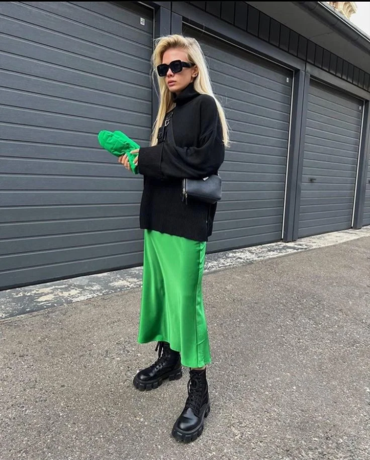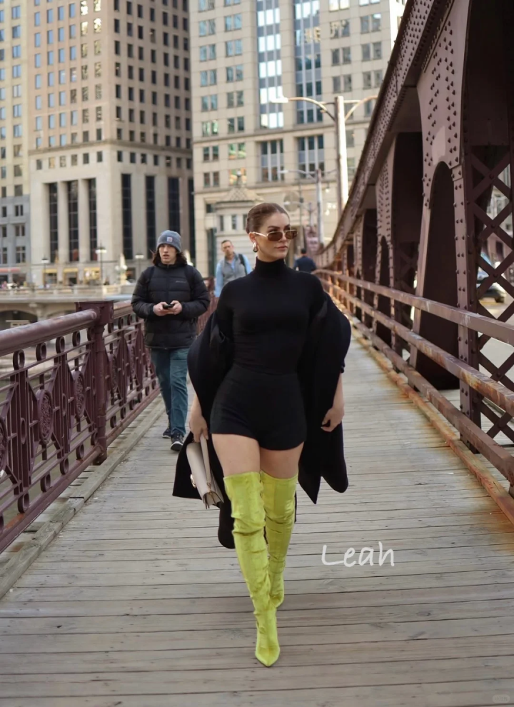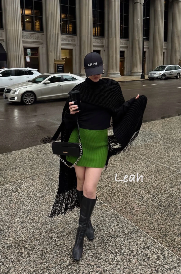 穿小面积绿就足够吸睛了。绿色短裙或荧光绿过膝靴是整套穿搭的点睛之笔,在全黑的压抑里跳出鲜活感,不用满身 logo,靠色彩就能赢很大。