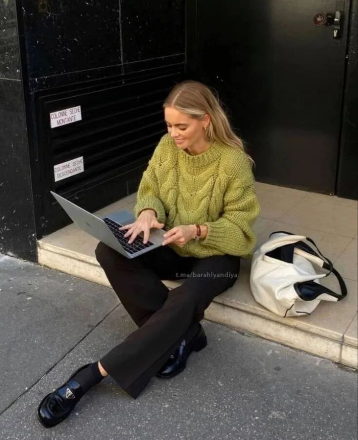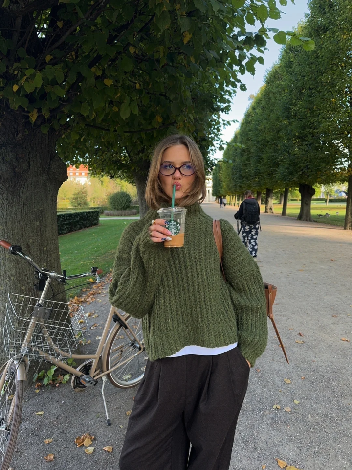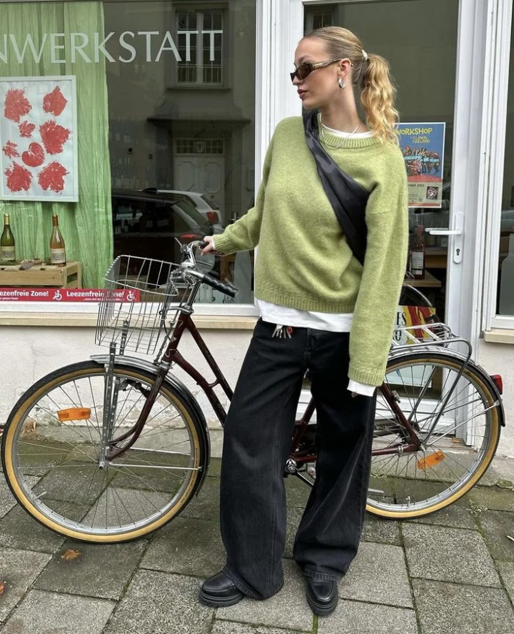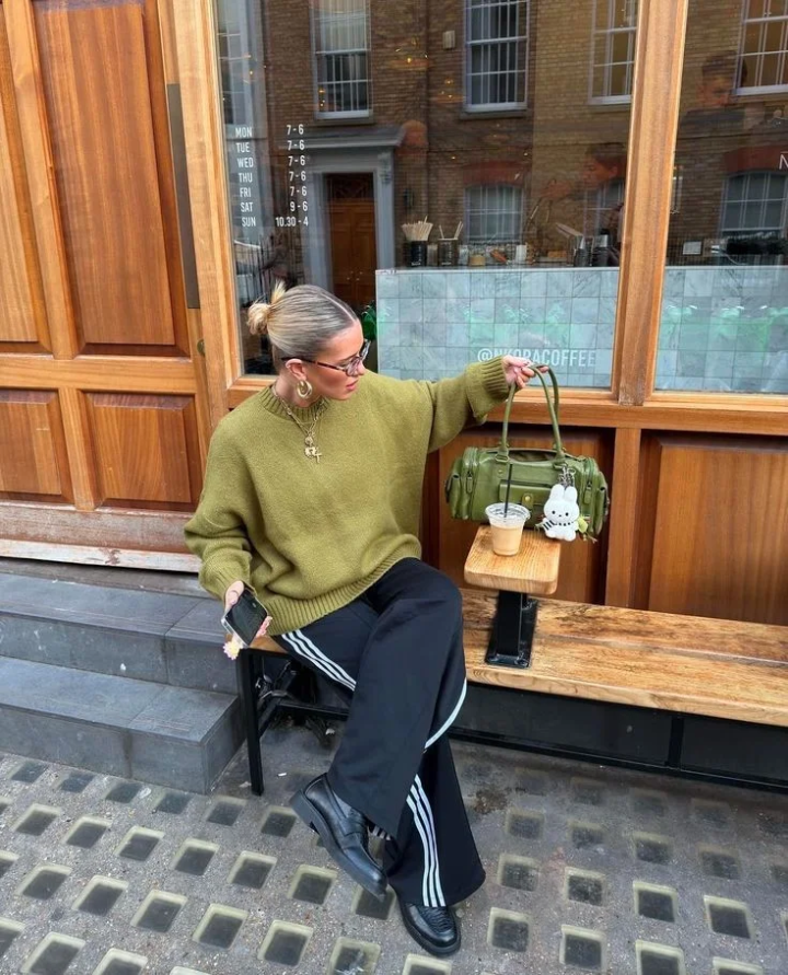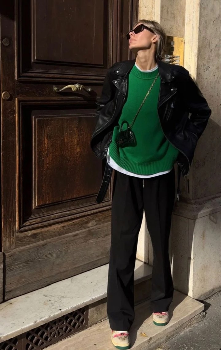 软糯的低饱和绿毛衣低饱和色调自带温柔滤镜,黄皮黑皮都能轻松驾驭,比亮绿更显质感,日常通勤不突兀。宽松版型藏肉显瘦,慵懒感拉满,不用刻意凹造型就很出片。黑色垂感阔腿裤 / 西装裤是秋冬刚需,高腰设计显腿长,垂坠感强不贴腿。