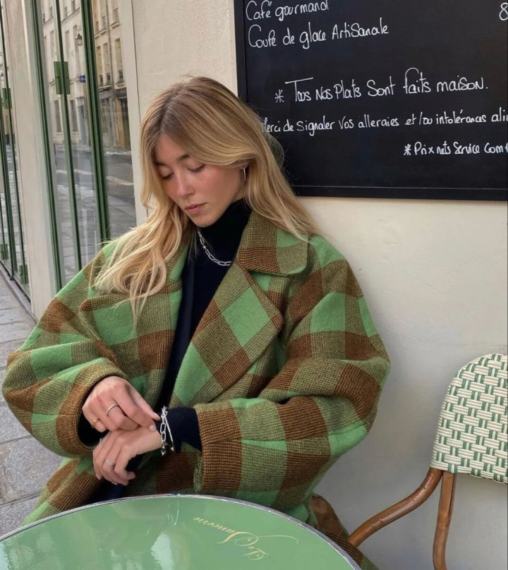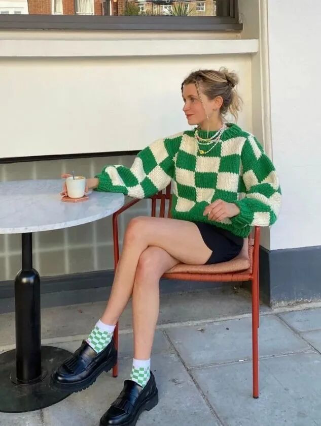 喜欢格纹的姐妹,可以选择绿色格子大衣,内搭也选黑色针织衫。也可以选择绿色格子毛衣,与绿格子袜子上下呼应起来。
