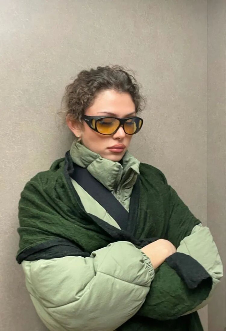 一件亮到发光的绿色外套 + 一条自带反光板的黑皮裤,真不是一般人能驾驭的,但视觉冲击力拉满,辣妹属性直接焊在身上。