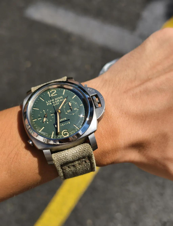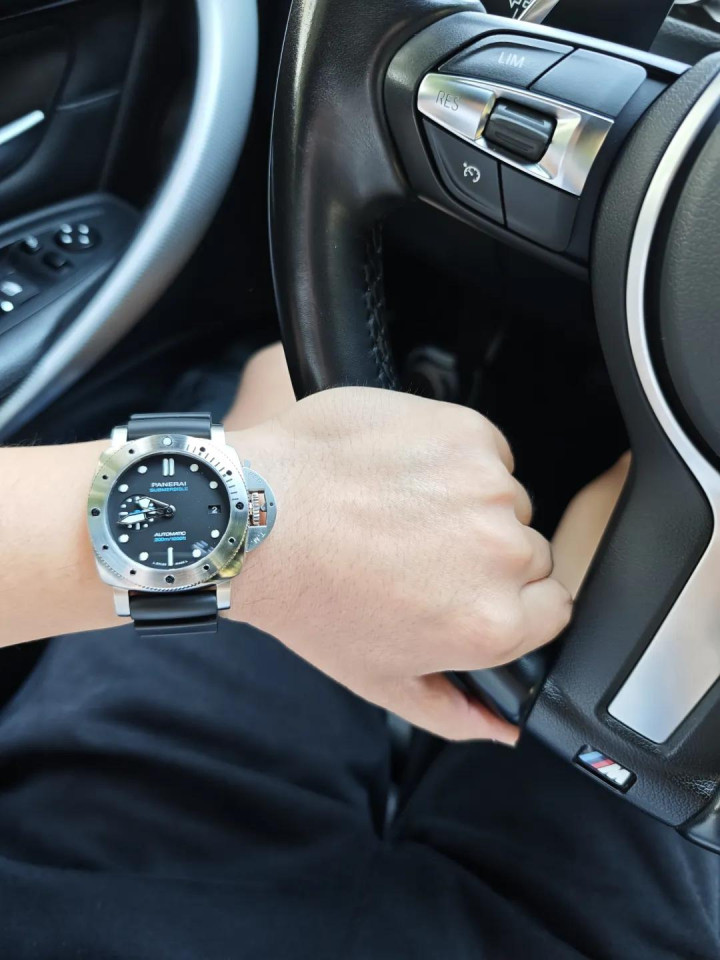 沛纳海一直是这些年心心念念想要入手的品牌,但是因为尺寸关系又望而却步,最终也算是被A哥成功说服,他在文章中多次提到手细不是拒绝沛纳海的理由,既然资深玩家如此建议那一定错不了。可能大多数第一次买沛纳海的朋友都会选择庐米诺系列,但是我却选择了潜行系列,因为它除了有标志性的表冠护桥与9点位小秒针以外,独特的精钢外圈设计也是非常的打动我,满足了一个大老爷们儿对于好莱坞硬汉形象的情怀和向往。