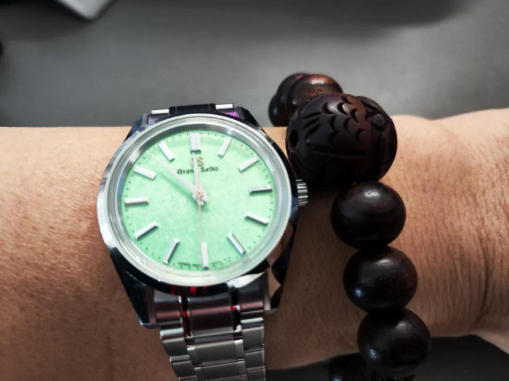 25年的春节是陪着妻女在日本,难得的放松时间。表态网有个帖子介绍“和纸”盘的冠蓝狮,心中一动,都到冠蓝狮的老家了,应该拿下一块。在大阪各个商场专柜询问,都说没有。很奇怪,原产地怎么会这么难买?奇怪,关键是说法不一,有说没货的,有说可以交点钱预定的,有说日本不卖的,真晕。都要放弃了,在家电器店的一个柜台,是个东北小伙,沟通就顺畅多了,他给指了条路,心斋桥有个专卖店,如果他家没有就是没有了。到了店里一问,确实不在日本销售,失望中,接待我们的是位台湾的女士,拿出来了一款过几天才卖的表,说是初春的绿,就是这块表,也很不错啊,于是就有了这块表。