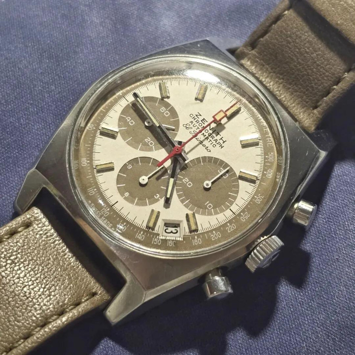 临近年底的拍卖上,终于找到了1969年原版真力时A384热带面。2019年是真力时推出这款A384自动计时表50周年,也顺势推出复刻款。当时我刚毕业,这款熊猫盘面是我的白月光。后来接触了古董表,才知道1969年原版的黑色的小表盘会在紫外线与温度作用下逐渐褪色成棕色,更有韵味。六年之后,终于圆梦!顺带一提,它搭载的是世界上第一枚(有争议)自动计时机芯El Primero。这枚机芯后来也被劳力士用于90-00年代的迪通拿。