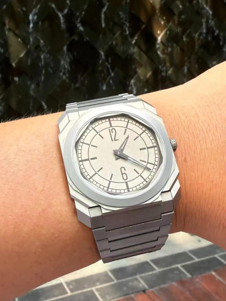 生日快乐,来自老婆的偏爱。这是一枚令人爱不释手的表款,带着复古气息的轨道盘,令人联想到宏伟的意大利建筑,与octo finissimo极具现代设计的表壳,形成有趣的对比。octo finissimo少见的两针设计,移除了7 点位的小秒针,从而营造出极为对称的视觉效果,时标与刻度的色调在不同角度与光线下会呈现黑-灰-黄铜的多变效果,让看似简单两针显示的手表实则富有赏玩趣味。