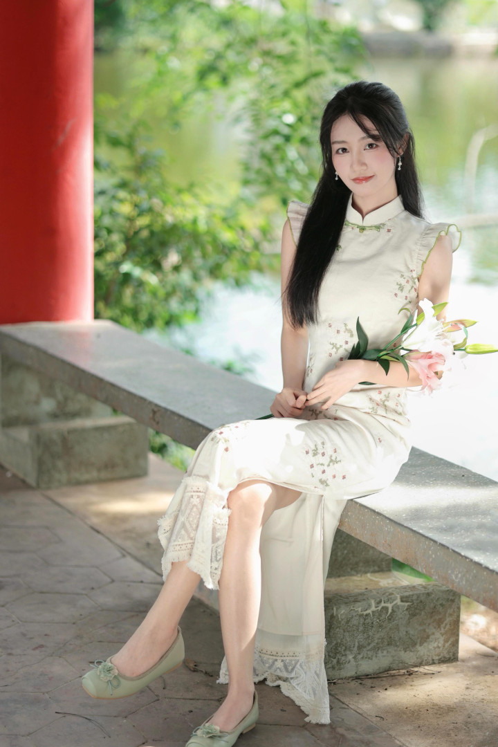 静谧的夜晚,少女穿着改良式旗袍连衣裙,开云底色是柔和的米白色,裙身从肩部到裙摆分布着浅绿与淡粉相间的细碎十字绣花图案,如同夜空中的精灵,神秘又优雅。她坐在石质长凳边缘,手持一束百合花,仿佛能让人感受到生活中的静谧与从容。▼