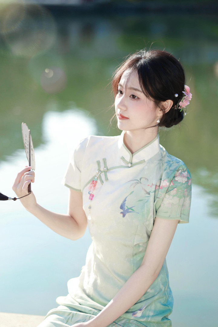 阳光斑驳的午后,少女换上了改良款旗袍,旗袍主体为米白色与淡绿色渐变的带有暗纹的顺滑面料,胸前位置有一只蓝紫色的燕子与粉色花枝,仿佛夜空中绽放的烟花,既耀眼又迷人。她坐在户外水景旁,微风拂动裙摆,仿佛能让人感受到生活中的浪漫与诗意。▼