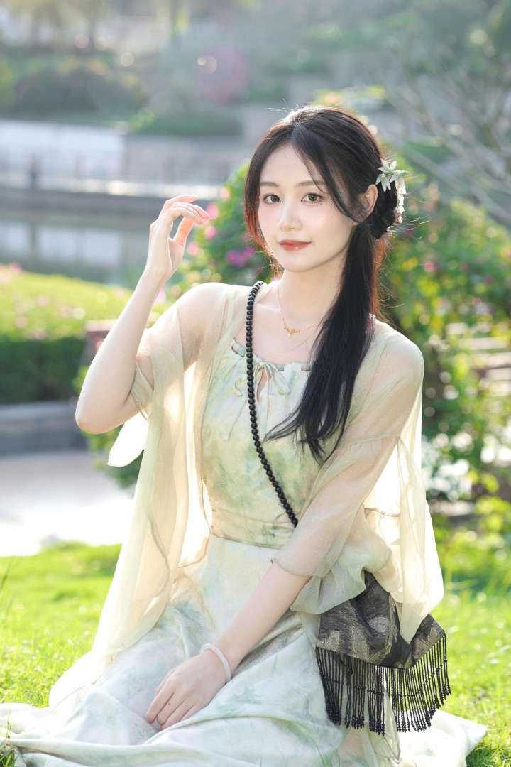 秋日的暖阳下,少女穿着新中式风格的服饰,内搭是一件底色为米白、带有晕染感淡绿色暗纹的吊带裙,外搭一件浅米金色的半透明罩衫,如同温柔的云朵包裹着她。她坐在翠绿的草地上,笑容甜美,仿佛能让人忘却一切烦恼,沉浸在这片刻的宁静与美好之中。▼