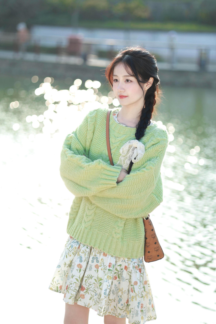 慵懒的午后,少女穿着嫩绿色的粗线针织圆领毛衣与米白色底的碎花短裙,嫩绿色的清新与碎花短裙的温柔相互搭配,仿佛一幅复古的油画,让人感受到岁月的沉淀与优雅。她双臂交叉抱在胸前,悠然自得,仿佛能让人沉浸在这慵懒的氛围中。▼