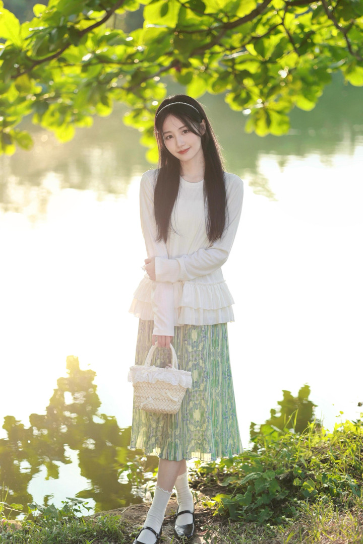 清新的早晨,少女身着米白色竖坑条针织长袖上衣与带有淡绿色、浅蓝色晕染花卉图案的雪纺百褶半身裙,米白色的纯净与淡绿色的清新相互映衬,如同春日里的花朵,既清新又优雅。她站在水边,阳光洒在她身上,仿佛能让人感受到生活中的美好与希望。