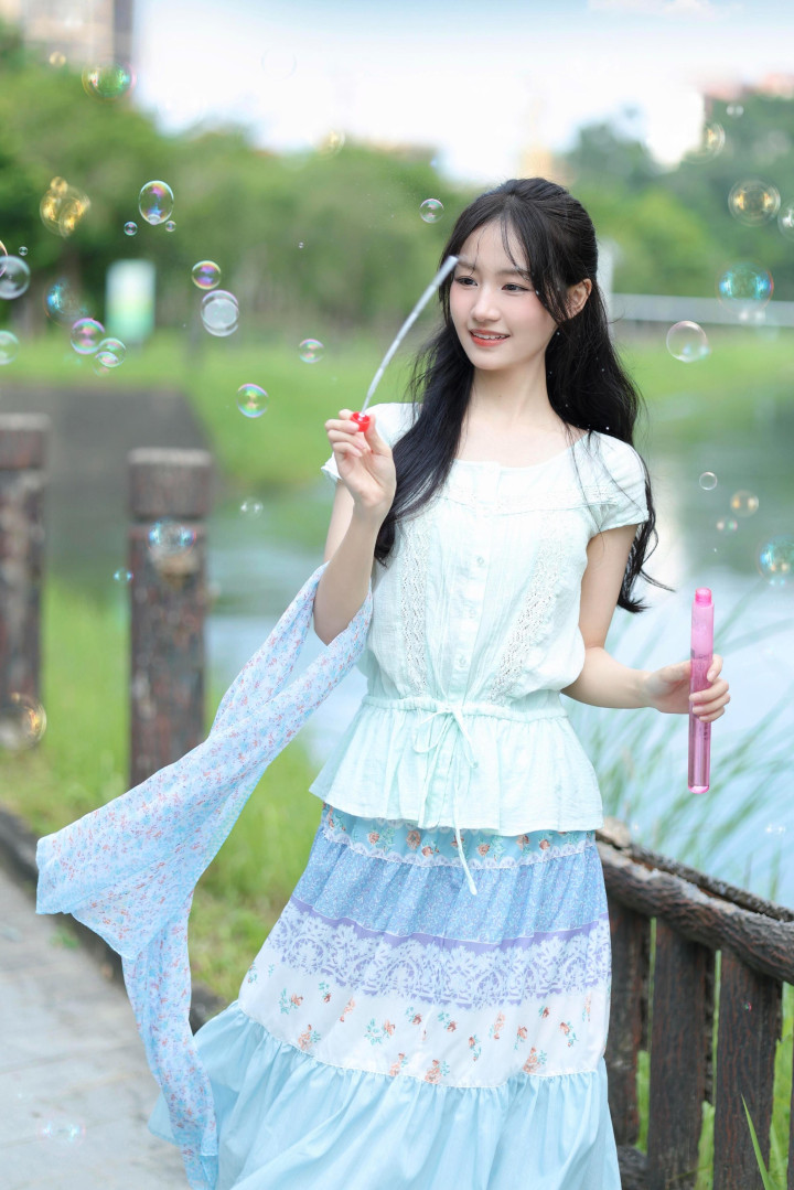 温柔的月光下,少女换上了薄荷绿色的方领短袖收腰衬衫与分层设计的拼接碎花长裙,薄荷绿色的清新与碎花长裙的柔美相互交融,如同燃烧的火焰,既热烈又迷人。她手持泡泡杆,泡泡在阳光下折射出彩虹色的光泽,仿佛能让人感受到生活中的激情与浪漫。▼