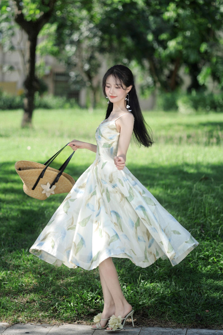 在温柔的阳光洒下,少女身着米白色底的吊带长裙,裙身带有水彩晕染风格的浅绿、淡蓝与浅棕色调的叶片图案,仿佛行走在春日的花园中,每一步都带着温柔与优雅。米白色的纯净与浅绿的清新相互交融,勾勒出她纤细的身形,让人感受到岁月的静好与从容。▼