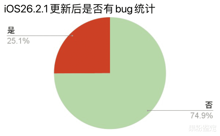 升级到iOS26.2.1是否有bug,根据网友反馈统计,有25.1%用户的升级到iOS26.2.1有bug,有74.9%的用户升级到iOS26.2.1没有bug。
